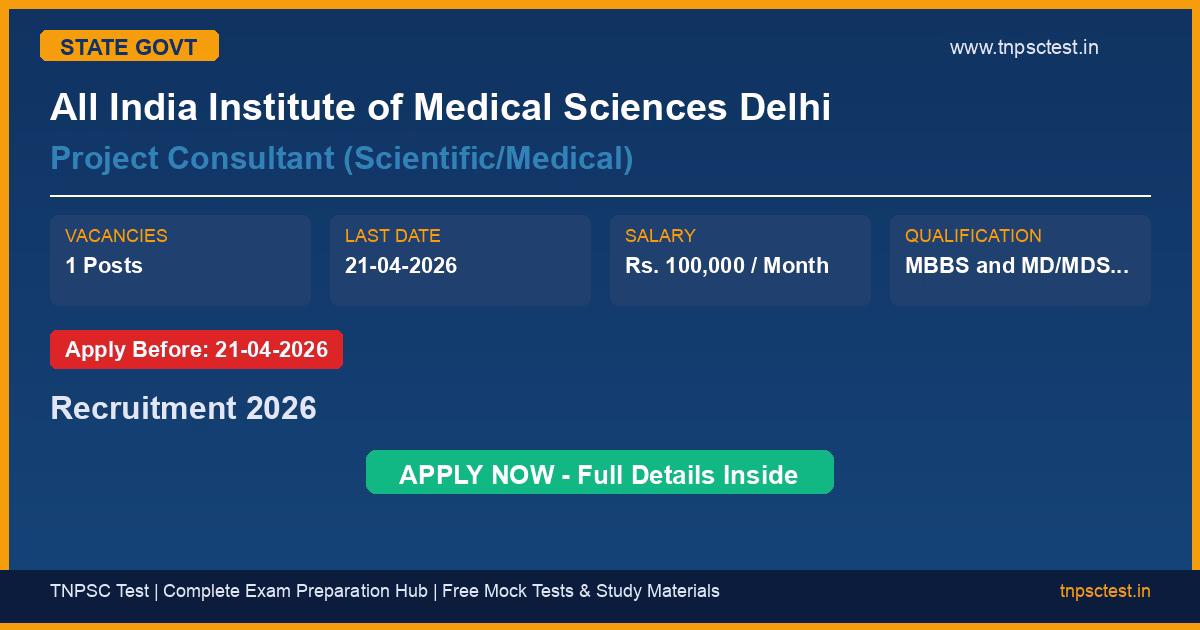 All India Institute of Medical Sciences Delhi has released an official recruitment notification for the post of Project Consultant (Scientific/Medical). A total of 1 vacancies have been announced for this state government recruitment 2026. Candidates who have completed MBBS and MD/MDS or equivalent degree in relevant subject with published papers; preference for MD in Radiology or Pathology or Diploma in Pathology with one year experience. from a recognized university or institution are eligible to apply. The last date to submit the online application is 21-04-2026. Read below for complete details on eligibility criteria, application fee, selection process, salary, and how to apply for this All India Institute of Medical Sciences Delhi recruitment.