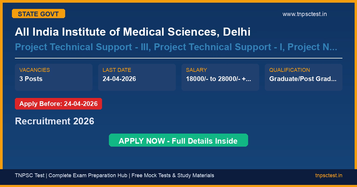 All India Institute of Medical Sciences, Delhi has released an official recruitment notification for the post of Project Technical Support – III, Project Technical Support – I, Project Nurse – I. A total of 3 vacancies have been announced for this state government recruitment 2026. Candidates who have completed Graduate/Post Graduate in Psychology/Social Work or ANM/Nursing from a recognized university or institution are eligible to apply. The last date to submit the online application is 24-04-2026. Read below for complete details on eligibility criteria, application fee, selection process, salary, and how to apply for this All India Institute of Medical Sciences, Delhi recruitment.