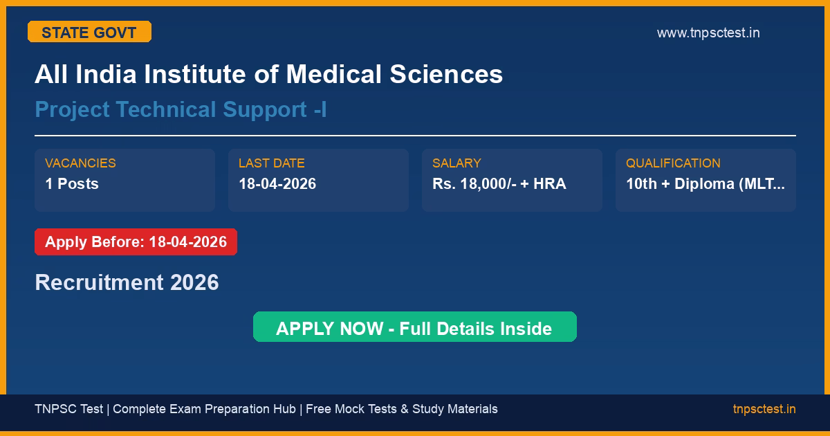 All India Institute of Medical Sciences has released an official recruitment notification for the post of Project Technical Support -I. A total of 1 vacancies have been announced for this state government recruitment 2026. Candidates who have completed 10th + Diploma (MLT/DMLT / ITI or equivalent) OR Three years Graduate degree (BSc) in relevant subject from a recognized university or institution are eligible to apply. The last date to submit the online application is 18-04-2026. Read below for complete details on eligibility criteria, application fee, selection process, salary, and how to apply for this All India Institute of Medical Sciences recruitment.