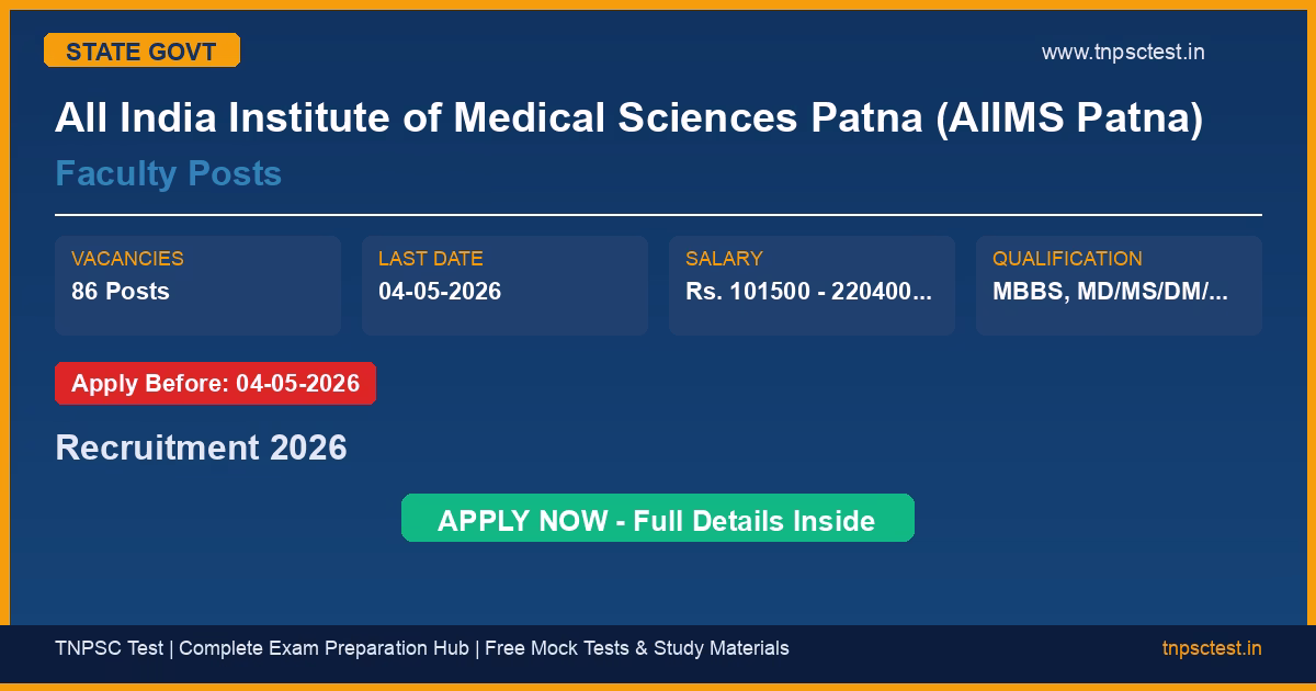 All India Institute of Medical Sciences Patna (AIIMS Patna) has released an official recruitment notification for the post of Faculty Posts. A total of 86 vacancies have been announced for this state government recruitment 2026. Candidates who have completed MBBS, MD/MS/DM/MCh (department specific), Teaching/Research Experience (3 to 14 years post PG depending on post and specialty) from a recognized university or institution are eligible to apply. The last date to submit the online application is 04-05-2026. Read below for complete details on eligibility criteria, application fee, selection process, salary, and how to apply for this All India Institute of Medical Sciences Patna (AIIMS Patna) recruitment.