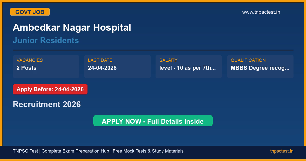 Ambedkar Nagar Hospital has released an official recruitment notification for the post of Junior Residents. A total of 2 vacancies have been announced for this government recruitment 2026. Candidates who have completed MBBS Degree recognized by MCI. from a recognized university or institution are eligible to apply. The last date to submit the online application is 24-04-2026. Read below for complete details on eligibility criteria, application fee, selection process, salary, and how to apply for this Ambedkar Nagar Hospital recruitment.