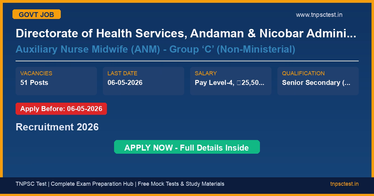 Directorate of Health Services, Andaman & Nicobar Administration has released an official recruitment notification for the post of Auxiliary Nurse Midwife (ANM) – Group ‘C’ (Non-Ministerial). A total of 51 posts vacancies have been announced for this government recruitment 2026. Candidates who have completed Senior Secondary (XII) from a recognised Board + ANM Certificate Course with valid training certificate from a recognised institute from a recognized university or institution are eligible to apply. The last date to submit the online application is 06-05-2026. Read below for complete details on eligibility criteria, application fee, selection process, salary, and how to apply for this Directorate of Health Services, Andaman & Nicobar Administration recruitment.