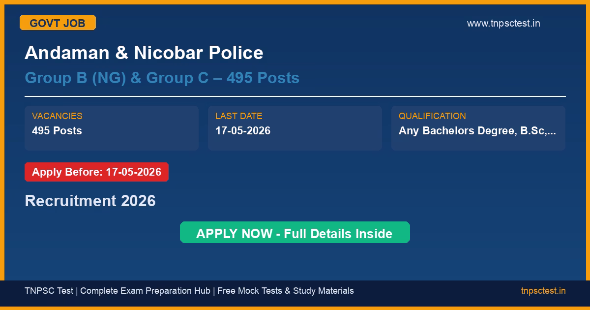 Andaman & Nicobar Police has released an official recruitment notification for the post of Group B (NG) & Group C – 495 Posts. A total of 495 (post-wise & unit-wise; subject to variation) vacancies have been announced for this government recruitment 2026. Candidates who have completed Any Bachelors Degree, B.Sc, B.Tech/B.E, Diploma, ITI, 12TH, 10TH from a recognized university or institution are eligible to apply. The last date to submit the online application is 17-05-2026. Read below for complete details on eligibility criteria, application fee, selection process, salary, and how to apply for this Andaman & Nicobar Police recruitment.