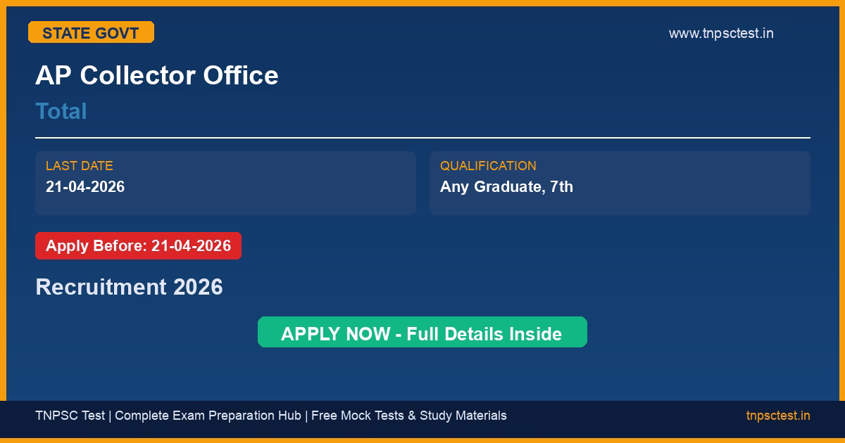 AP Collector Office has released an official recruitment notification for the post of Total. Candidates who have completed Any Graduate, 7th from a recognized university or institution are eligible to apply. The last date to submit the online application is 21-04-2026. Read below for complete details on eligibility criteria, application fee, selection process, salary, and how to apply for this AP Collector Office recruitment.