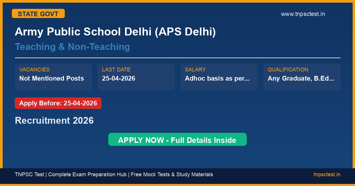 Army Public School Delhi (APS Delhi) has released an official recruitment notification for the post of Teaching & Non-Teaching. A total of Not Mentioned vacancies have been announced for this state government recruitment 2026. Candidates who have completed Any Graduate, B.Ed, B.Sc, Diploma, B.Lib, Any Post Graduate from a recognized university or institution are eligible to apply. The last date to submit the online application is 25-04-2026. Read below for complete details on eligibility criteria, application fee, selection process, salary, and how to apply for this Army Public School Delhi (APS Delhi) recruitment.