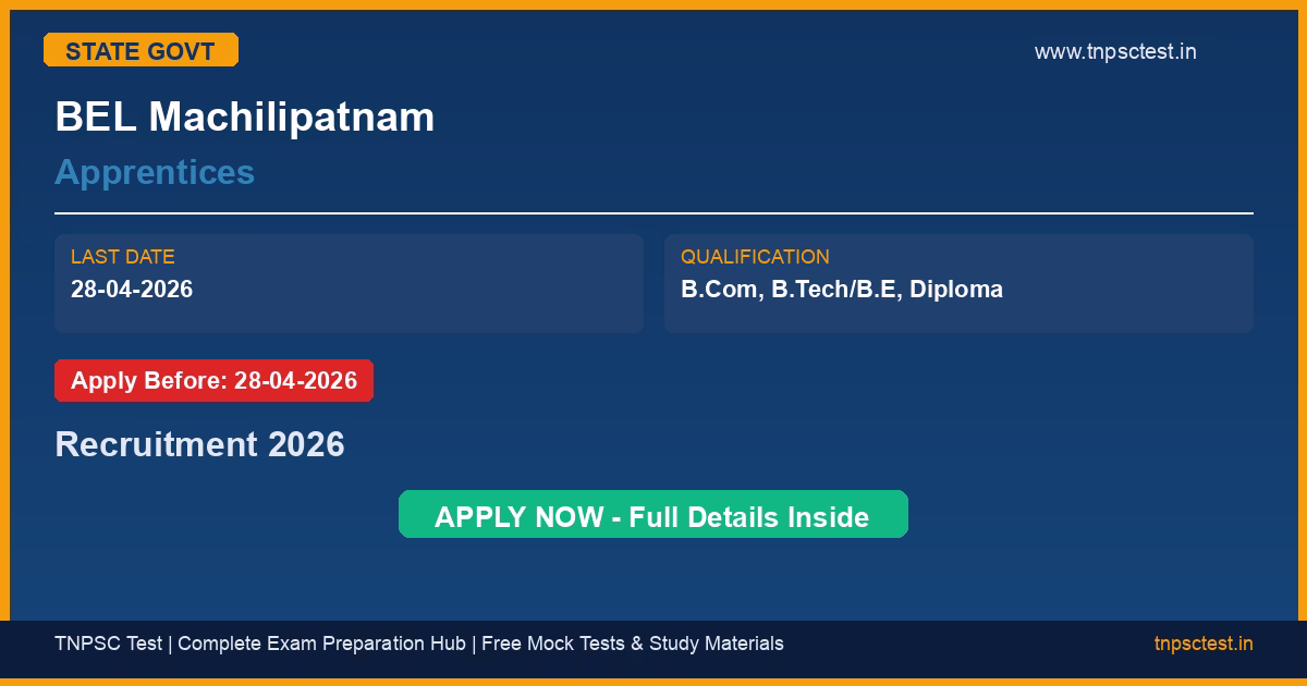BEL Machilipatnam has released an official recruitment notification for the post of Apprentices. Candidates who have completed B.Com, B.Tech/B.E, Diploma from a recognized university or institution are eligible to apply. The last date to submit the online application is 28-04-2026. Read below for complete details on eligibility criteria, application fee, selection process, salary, and how to apply for this BEL Machilipatnam recruitment.