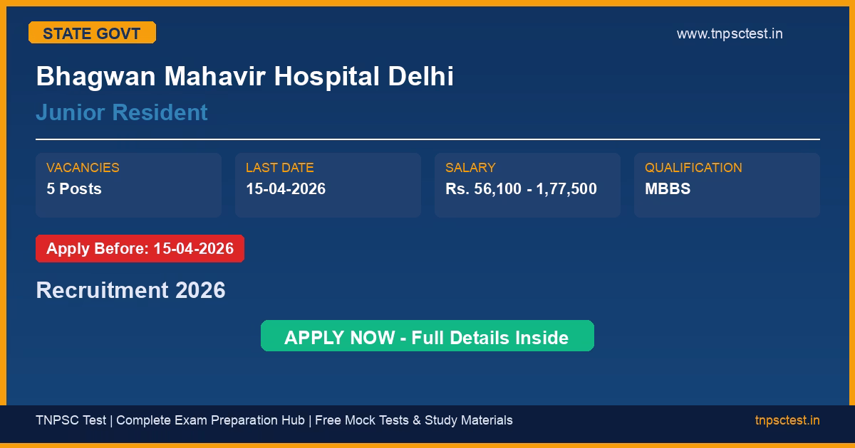 Bhagwan Mahavir Hospital Delhi has released an official recruitment notification for the post of Junior Resident. A total of 5 vacancies have been announced for this state government recruitment 2026. Candidates who have completed MBBS from a recognized university or institution are eligible to apply. The last date to submit the online application is 15-04-2026. Read below for complete details on eligibility criteria, application fee, selection process, salary, and how to apply for this Bhagwan Mahavir Hospital Delhi recruitment.