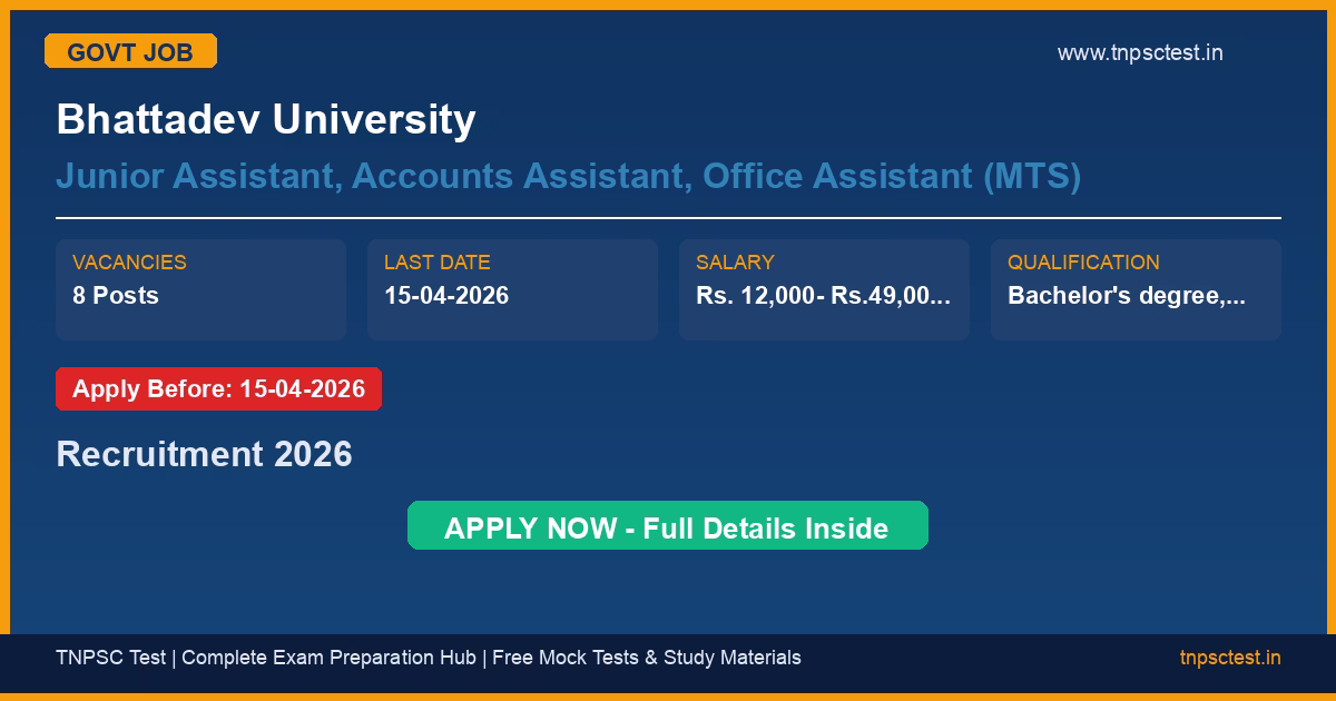 Bhattadev University has released an official recruitment notification for the post of Junior Assistant, Accounts Assistant, Office Assistant (MTS). A total of 8 vacancies have been announced for this government recruitment 2026. Candidates who have completed Bachelor’s degree, HSLC (Class X) from a recognized university or institution are eligible to apply. The last date to submit the online application is 15-04-2026. Read below for complete details on eligibility criteria, application fee, selection process, salary, and how to apply for this Bhattadev University recruitment.