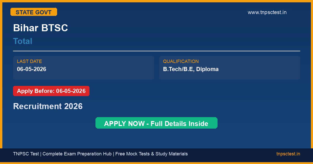 Bihar BTSC has released an official recruitment notification for the post of Total. Candidates who have completed B.Tech/B.E, Diploma from a recognized university or institution are eligible to apply. The last date to submit the online application is 06-05-2026. Read below for complete details on eligibility criteria, application fee, selection process, salary, and how to apply for this Bihar BTSC recruitment.
