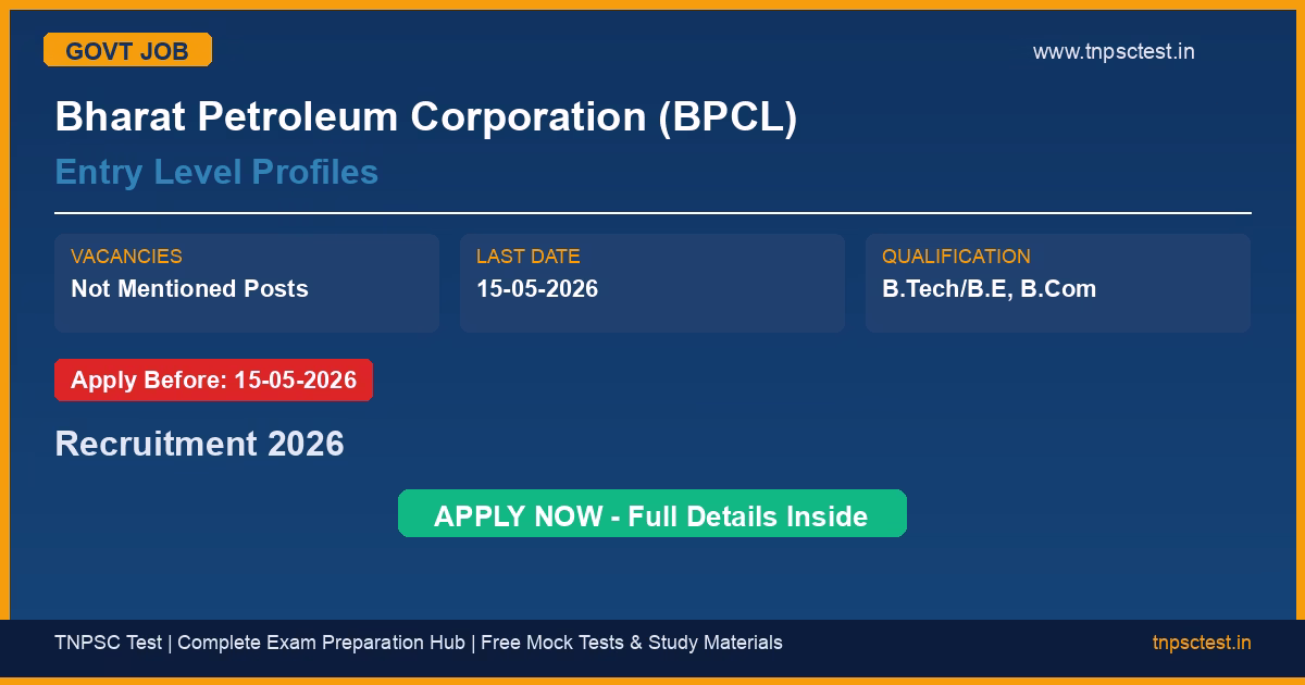 Bharat Petroleum Corporation (BPCL) has released an official recruitment notification for the post of Entry Level Profiles. A total of Not Mentioned vacancies have been announced for this government recruitment 2026. Candidates who have completed B.Tech/B.E, B.Com from a recognized university or institution are eligible to apply. The last date to submit the online application is 15-05-2026. Read below for complete details on eligibility criteria, application fee, selection process, salary, and how to apply for this Bharat Petroleum Corporation (BPCL) recruitment.