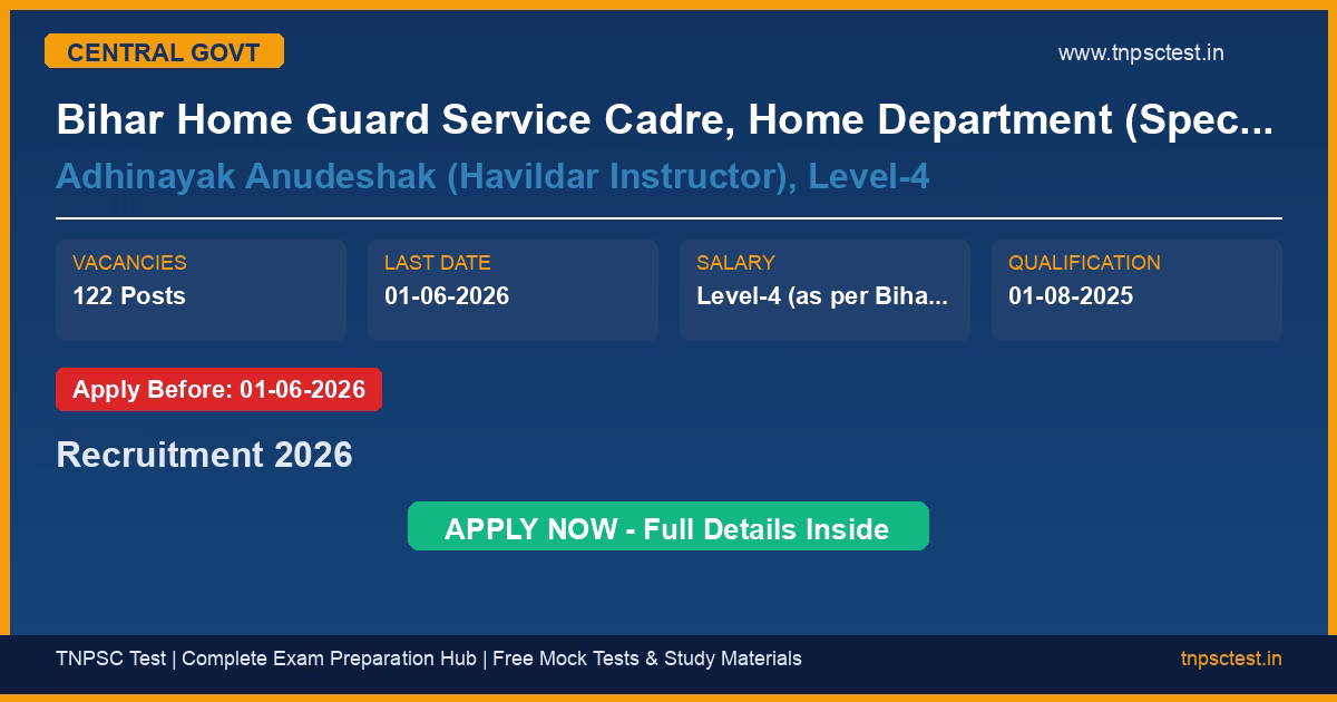 Bihar Home Guard Service Cadre, Home Department (Special Branch), Govt. of Bihar has released an official recruitment notification for the post of Adhinayak Anudeshak (Havildar Instructor), Level-4. A total of 122 (One Hundred Twenty Two) vacancies have been announced for this central government recruitment 2026. Candidates who have completed 01-08-2025 from a recognized university or institution are eligible to apply. The last date to submit the online application is 01-06-2026. Read below for complete details on eligibility criteria, application fee, selection process, salary, and how to apply for this Bihar Home Guard Service Cadre, Home Department (Special Branch), Govt. of Bihar recruitment.