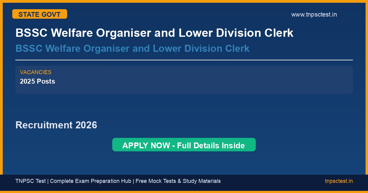 BSSC Welfare Organiser and Lower Division Clerk has released an official recruitment notification for the post of BSSC Welfare Organiser and Lower Division Clerk. A total of BSSC Welfare Organiser & Lower Division Clerk Notification 2025 : Age Limit as on 01/08/2024 Minimum Age : 21 Years. Maximum Age : 57 Years. Age Relaxation Extra as per BSSC Welfare Organiser & Lower Division Clerk Vacancy 2025 Advt No 02/2025 Recruitment Rules. vacancies have been announced for this state government recruitment 2026. Read below for complete details on eligibility criteria, application fee, selection process, salary, and how to apply for this BSSC Welfare Organiser and Lower Division Clerk recruitment.
