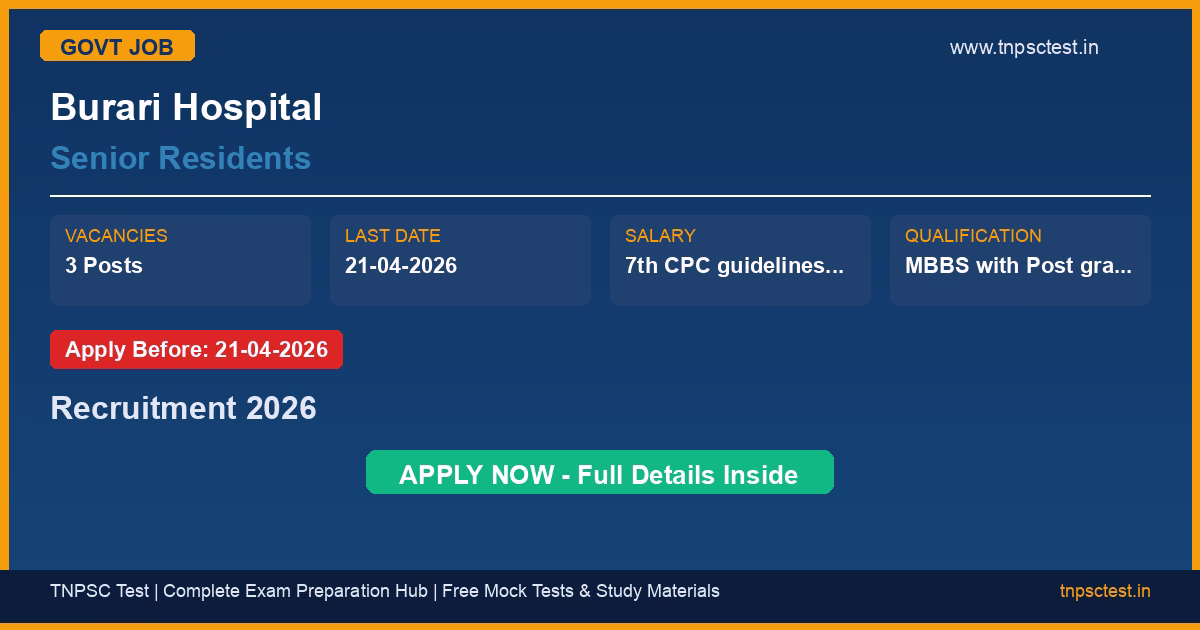 Burari Hospital has released an official recruitment notification for the post of Senior Residents. A total of 3 vacancies have been announced for this government recruitment 2026. Candidates who have completed MBBS with Post graduate degree/DNB/Diploma from a recognized university or institution are eligible to apply. The last date to submit the online application is 21-04-2026. Read below for complete details on eligibility criteria, application fee, selection process, salary, and how to apply for this Burari Hospital recruitment.
