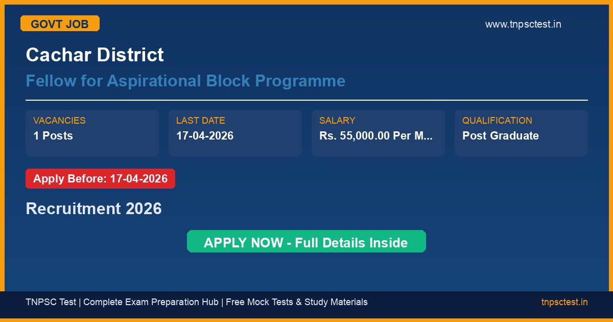 Cachar District has released an official recruitment notification for the post of Fellow for Aspirational Block Programme. A total of 1 vacancies have been announced for this government recruitment 2026. Candidates who have completed Post Graduate from a recognized university or institution are eligible to apply. The last date to submit the online application is 17-04-2026. Read below for complete details on eligibility criteria, application fee, selection process, salary, and how to apply for this Cachar District recruitment.