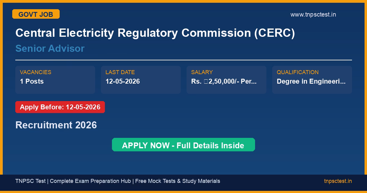 Central Electricity Regulatory Commission (CERC) has released an official recruitment notification for the post of Senior Advisor. A total of 1 vacancies have been announced for this government recruitment 2026. Candidates who have completed Degree in Engineering, MBA/ PG Diploma in Financial Management or equivalent from a recognized university or institution are eligible to apply. The last date to submit the online application is 12-05-2026. Read below for complete details on eligibility criteria, application fee, selection process, salary, and how to apply for this Central Electricity Regulatory Commission (CERC) recruitment.