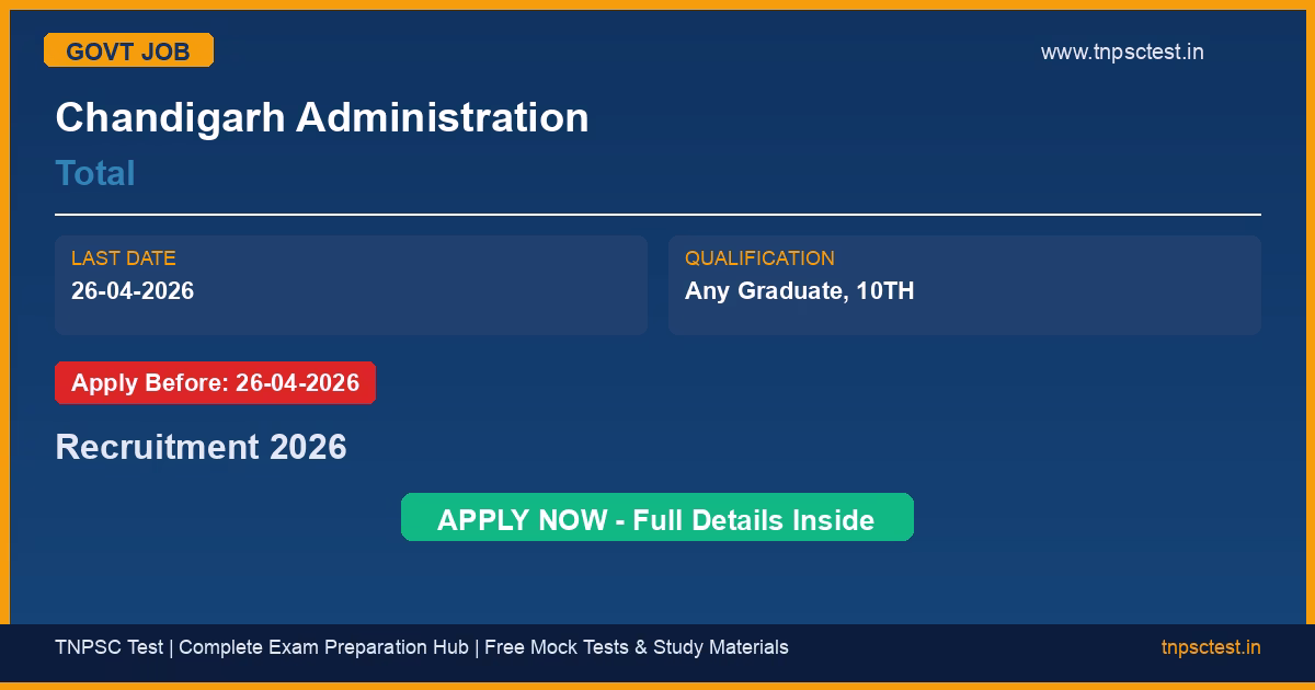 Chandigarh Administration has released an official recruitment notification for the post of Total. Candidates who have completed Any Graduate, 10TH from a recognized university or institution are eligible to apply. The last date to submit the online application is 26-04-2026. Read below for complete details on eligibility criteria, application fee, selection process, salary, and how to apply for this Chandigarh Administration recruitment.