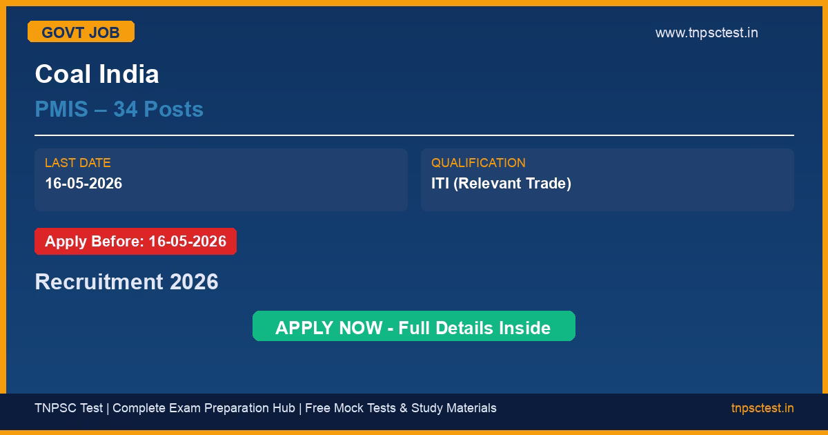 Coal India has released an official recruitment notification for the post of PMIS – 34 Posts. Candidates who have completed ITI (Relevant Trade) from a recognized university or institution are eligible to apply. The last date to submit the online application is 16-05-2026. Read below for complete details on eligibility criteria, application fee, selection process, salary, and how to apply for this Coal India recruitment.
