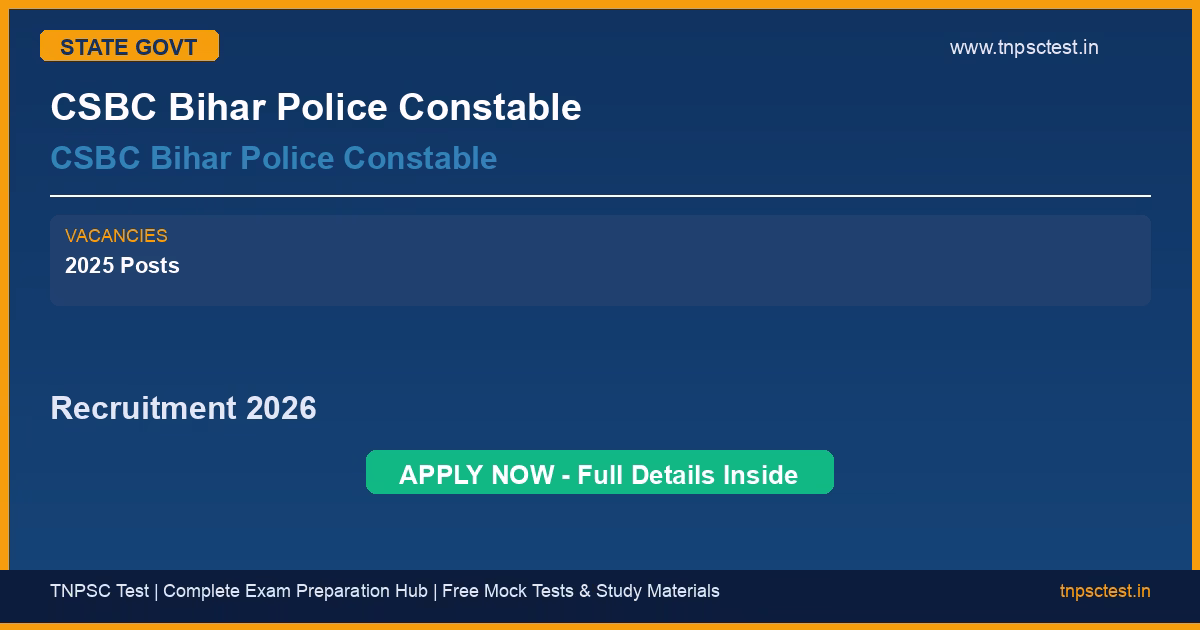 CSBC Bihar Police Constable has released an official recruitment notification for the post of CSBC Bihar Police Constable. A total of CSBC Bihar Constable Exam 2025 : Vacancy Details Total : 19838 Post vacancies have been announced for this state government recruitment 2026. Read below for complete details on eligibility criteria, application fee, selection process, salary, and how to apply for this CSBC Bihar Police Constable recruitment.