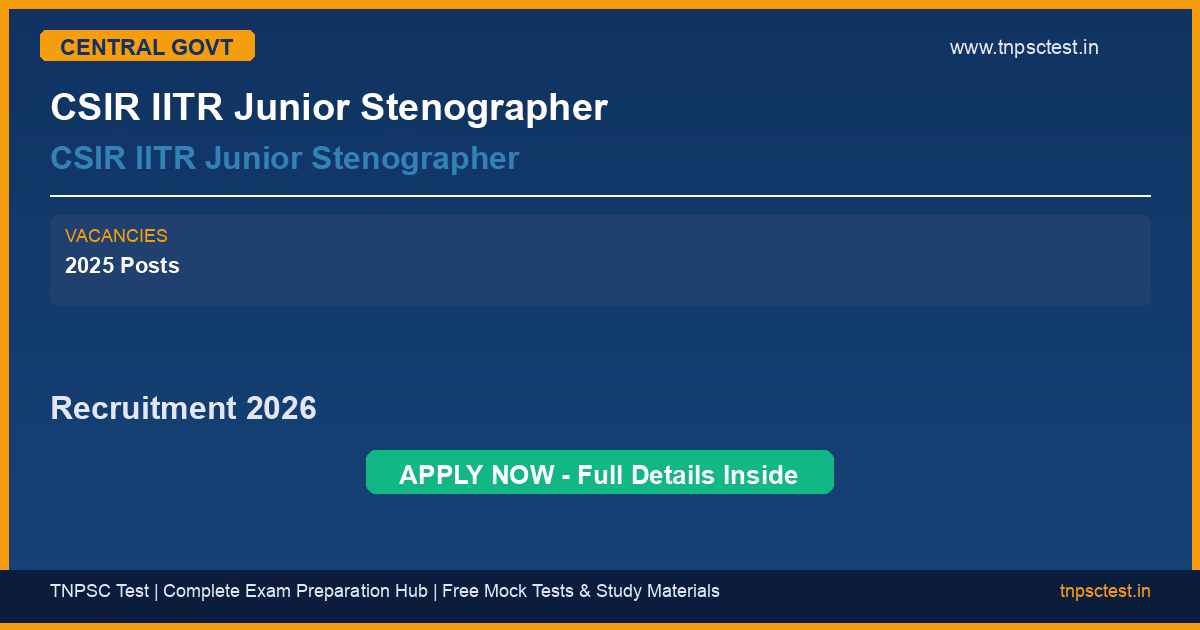 CSIR IITR Junior Stenographer has released an official recruitment notification for the post of CSIR IITR Junior Stenographer. A total of CSIR IITR Junior Stenographer Recruitment 2025: Vacancy Details Total : 04 Post vacancies have been announced for this central government recruitment 2026. Read below for complete details on eligibility criteria, application fee, selection process, salary, and how to apply for this CSIR IITR Junior Stenographer recruitment.