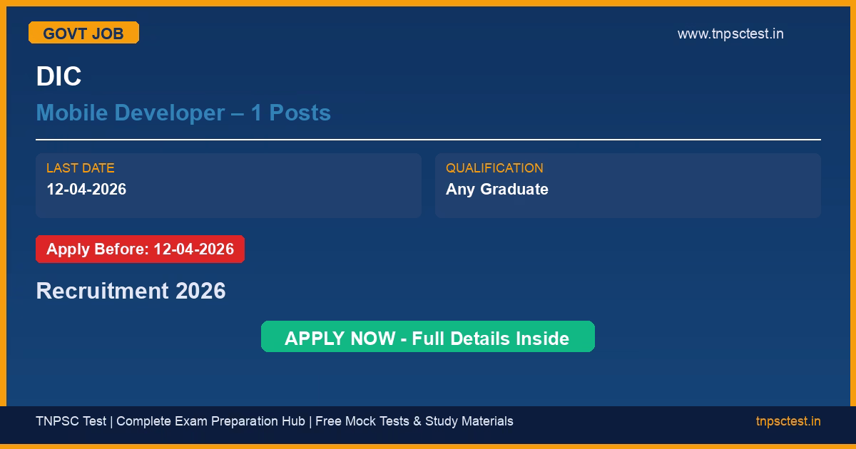 DIC has released an official recruitment notification for the post of Mobile Developer – 1 Posts. Candidates who have completed Any Graduate from a recognized university or institution are eligible to apply. The last date to submit the online application is 12-04-2026. Read below for complete details on eligibility criteria, application fee, selection process, salary, and how to apply for this DIC recruitment.