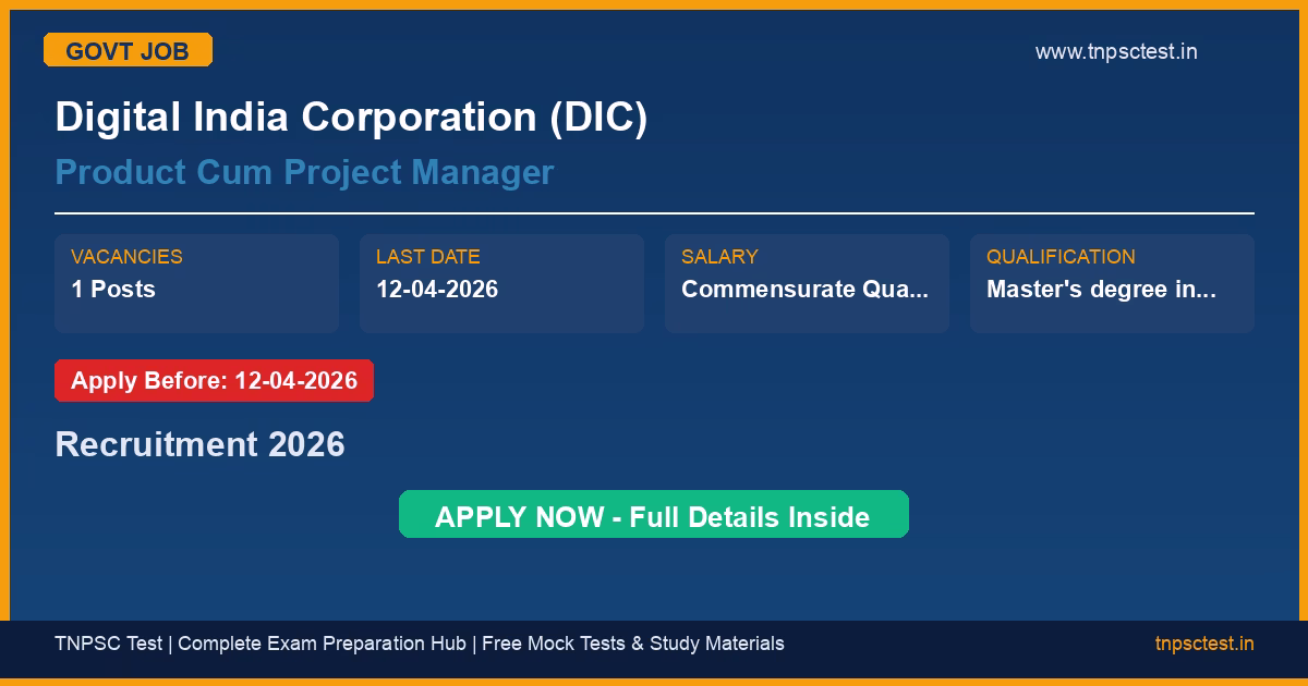 Digital India Corporation (DIC) has released an official recruitment notification for the post of Product Cum Project Manager. A total of 1 vacancies have been announced for this government recruitment 2026. Candidates who have completed Master’s degree in Business Administration, Project Management, or in a related field with 7+ years of experience. from a recognized university or institution are eligible to apply. The last date to submit the online application is 12-04-2026. Read below for complete details on eligibility criteria, application fee, selection process, salary, and how to apply for this Digital India Corporation (DIC) recruitment.