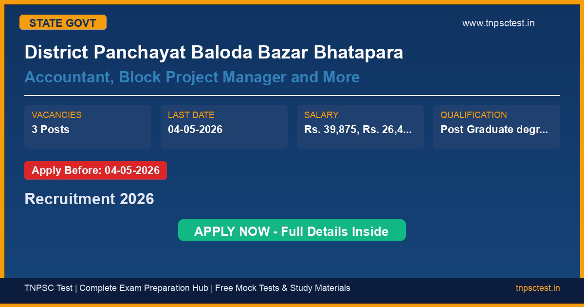 District Panchayat Baloda Bazar Bhatapara has released an official recruitment notification for the post of Accountant, Block Project Manager and More. A total of 3 vacancies have been announced for this state government recruitment 2026. Candidates who have completed Post Graduate degree / 2-year Diploma, Graduation, B.Com from a recognized university or institution are eligible to apply. The last date to submit the online application is 04-05-2026. Read below for complete details on eligibility criteria, application fee, selection process, salary, and how to apply for this District Panchayat Baloda Bazar Bhatapara recruitment.