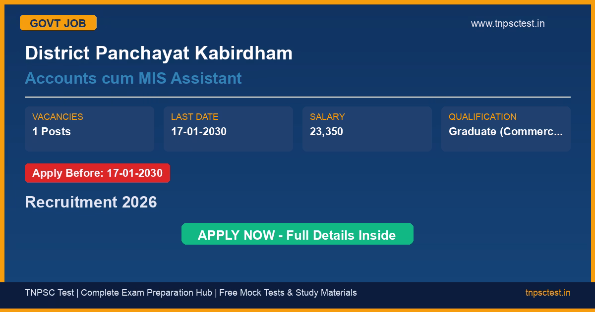 District Panchayat Kabirdham has released an official recruitment notification for the post of Accounts cum MIS Assistant. A total of 1 vacancies have been announced for this government recruitment 2026. Candidates who have completed Graduate (Commerce), 1 Year Diploma in Computer from a recognized university or institution are eligible to apply. The last date to submit the online application is 17-01-2030. Read below for complete details on eligibility criteria, application fee, selection process, salary, and how to apply for this District Panchayat Kabirdham recruitment.
