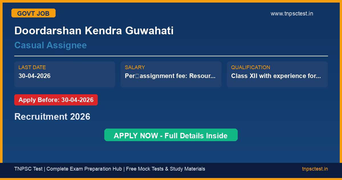 Doordarshan Kendra Guwahati has released an official recruitment notification for the post of Casual Assignee. Candidates who have completed Class XII with experience for Resource Person/Camera Assistant; Professional Degree/Diploma in Videography or Video Editing; Graduation with Digital Marketing/Social Media/Web Designing; Graduation with typing skills for CG Operator; Graduation with MS Excel certification for Library/Archive Assistant, plus post‑specific experience as mentioned in notification from a recognized university or institution are eligible to apply. The last date to submit the online application is 30-04-2026. Read below for complete details on eligibility criteria, application fee, selection process, salary, and how to apply for this Doordarshan Kendra Guwahati recruitment.