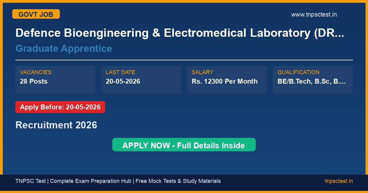 Defence Bioengineering & Electromedical Laboratory (DRDO DEBEL) has released an official recruitment notification for the post of Graduate Apprentice. A total of 28 vacancies have been announced for this government recruitment 2026. Candidates who have completed BE/B.Tech, B.Sc, B.Com, B.Lib/B.L.I.Sc from a recognized university or institution are eligible to apply. The last date to submit the online application is 20-05-2026. Read below for complete details on eligibility criteria, application fee, selection process, salary, and how to apply for this Defence Bioengineering & Electromedical Laboratory (DRDO DEBEL) recruitment.