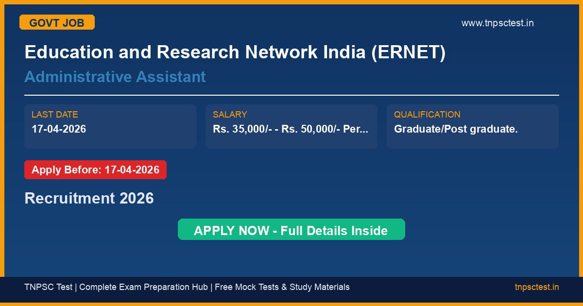 Education and Research Network India (ERNET) has released an official recruitment notification for the post of Administrative Assistant. Candidates who have completed Graduate/Post graduate. from a recognized university or institution are eligible to apply. The last date to submit the online application is 17-04-2026. Read below for complete details on eligibility criteria, application fee, selection process, salary, and how to apply for this Education and Research Network India (ERNET) recruitment.