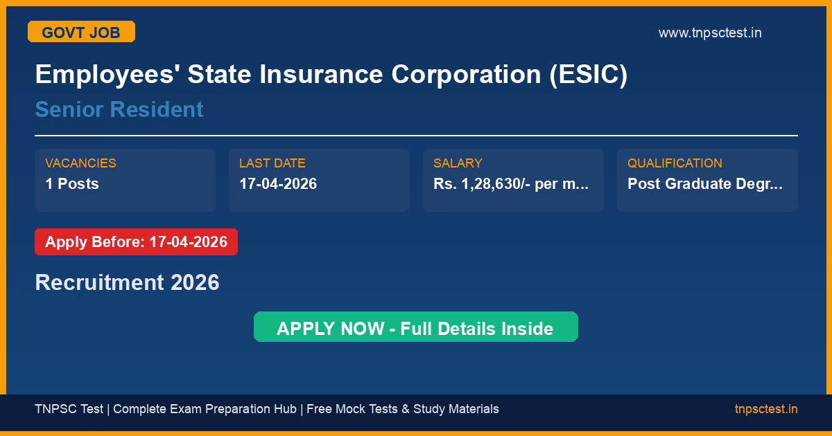 Employees’ State Insurance Corporation (ESIC) has released an official recruitment notification for the post of Senior Resident. A total of 1 vacancies have been announced for this government recruitment 2026. Candidates who have completed Post Graduate Degree or Post Graduate Diploma in concerned specialty or MBBS with 2 years experience in concerned specialty from a recognized university or institution are eligible to apply. The last date to submit the online application is 17-04-2026. Read below for complete details on eligibility criteria, application fee, selection process, salary, and how to apply for this Employees’ State Insurance Corporation (ESIC) recruitment.