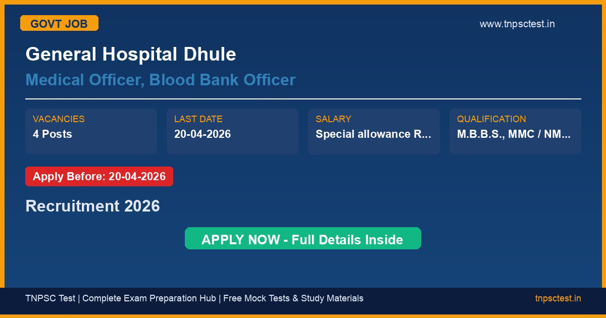 General Hospital Dhule has released an official recruitment notification for the post of Medical Officer, Blood Bank Officer. A total of 4 vacancies have been announced for this government recruitment 2026. Candidates who have completed M.B.B.S., MMC / NMC Registration from a recognized university or institution are eligible to apply. The last date to submit the online application is 20-04-2026. Read below for complete details on eligibility criteria, application fee, selection process, salary, and how to apply for this General Hospital Dhule recruitment.
