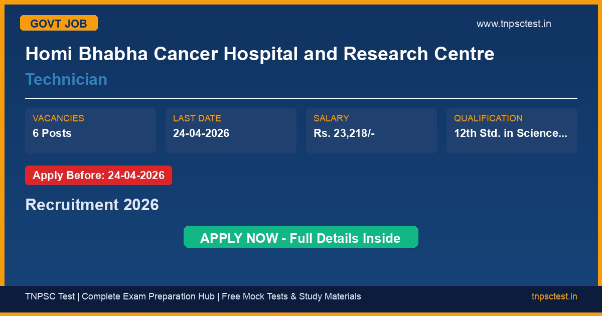 Homi Bhabha Cancer Hospital and Research Centre has released an official recruitment notification for the post of Technician. A total of 6 vacancies have been announced for this government recruitment 2026. Candidates who have completed 12th Std. in Science with Certificate course of 06 months or 01-year Diploma in Medical Laboratory Technology, B.Sc. (Radiological Imaging Technology), B.Sc. in any subject / B. Pharmacy with minimum two years’ Diploma in Medical Imaging Technology. from a recognized university or institution are eligible to apply. The last date to submit the online application is 24-04-2026. Read below for complete details on eligibility criteria, application fee, selection process, salary, and how to apply for this Homi Bhabha Cancer Hospital and Research Centre recruitment.