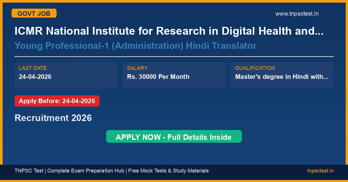 ICMR National Institute for Research in Digital Health and Data Science has released an official recruitment notification for the post of Young Professional-1 (Administration) Hindi Translator. Candidates who have completed Master’s degree in Hindi with English from a recognized university or institution are eligible to apply. The last date to submit the online application is 24-04-2026. Read below for complete details on eligibility criteria, application fee, selection process, salary, and how to apply for this ICMR National Institute for Research in Digital Health and Data Science recruitment.