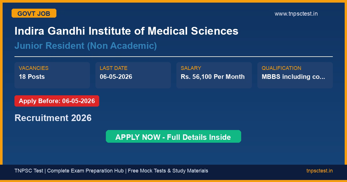 Indira Gandhi Institute of Medical Sciences has released an official recruitment notification for the post of Junior Resident (Non Academic). A total of 18 vacancies have been announced for this government recruitment 2026. Candidates who have completed MBBS including completion of Internship or equivalent degree recognized by NMC, Appeared in NEET-PG 2025 but did not get admission to any Medical College as per rules & regulations of Govt. of Bihar from a recognized university or institution are eligible to apply. The last date to submit the online application is 06-05-2026. Read below for complete details on eligibility criteria, application fee, selection process, salary, and how to apply for this Indira Gandhi Institute of Medical Sciences recruitment.