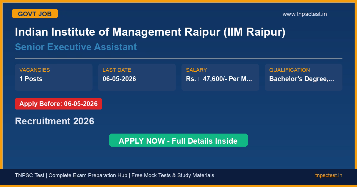 Indian Institute of Management Raipur (IIM Raipur) has released an official recruitment notification for the post of Senior Executive Assistant. A total of 1 vacancies have been announced for this government recruitment 2026. Candidates who have completed Bachelor’s Degree, Master’s degree with minimum 60% marks from a recognized university or institution are eligible to apply. The last date to submit the online application is 06-05-2026. Read below for complete details on eligibility criteria, application fee, selection process, salary, and how to apply for this Indian Institute of Management Raipur (IIM Raipur) recruitment.