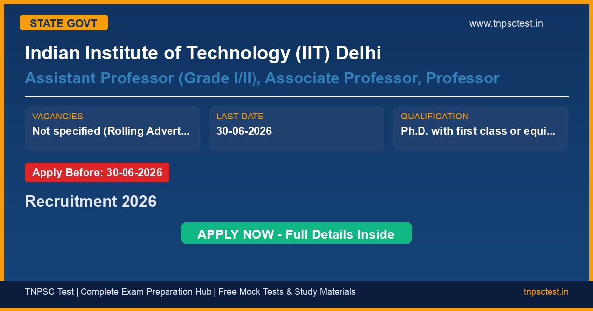 Indian Institute of Technology (IIT) Delhi has released an official recruitment notification for the post of Assistant Professor (Grade I/II), Associate Professor, Professor. A total of Not specified (Rolling Advertisement) vacancies have been announced for this state government recruitment 2026. Candidates who have completed Ph.D. with first class or equivalent in the preceding degree + Relevant Experience from a recognized university or institution are eligible to apply. The last date to submit the online application is 30-06-2026. Read below for complete details on eligibility criteria, application fee, selection process, salary, and how to apply for this Indian Institute of Technology (IIT) Delhi recruitment.
