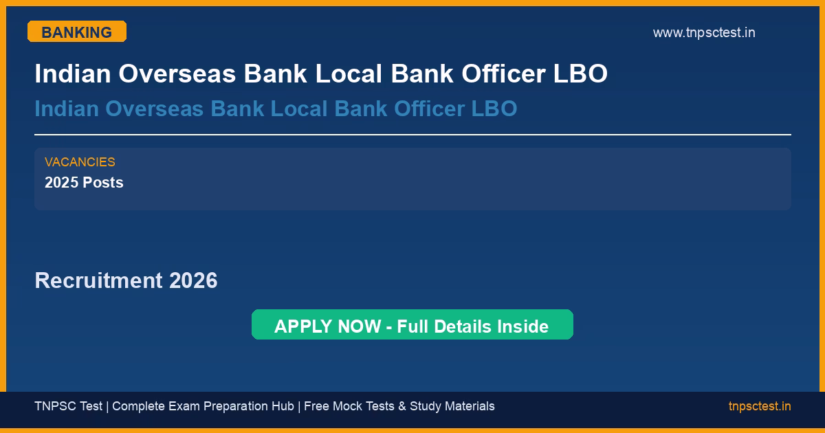 Indian Overseas Bank Local Bank Officer LBO has released an official recruitment notification for the post of Indian Overseas Bank Local Bank Officer LBO. A total of Indian Overseas Bank Local Bank Officer Recruitment 2025 : Vacancy Details Total : 400 Post vacancies have been announced for this banking recruitment 2026. Read below for complete details on eligibility criteria, application fee, selection process, salary, and how to apply for this Indian Overseas Bank Local Bank Officer LBO recruitment.