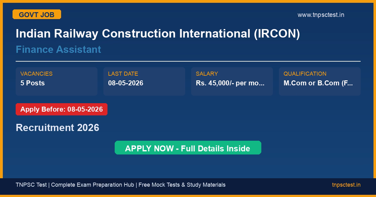 Indian Railway Construction International (IRCON) has released an official recruitment notification for the post of Finance Assistant. A total of 5 vacancies have been announced for this government recruitment 2026. Candidates who have completed M.Com or B.Com (Full time with not less than 55% marks) OR CA(Inter)/ CMA(Inter) from a recognized university or institution are eligible to apply. The last date to submit the online application is 08-05-2026. Read below for complete details on eligibility criteria, application fee, selection process, salary, and how to apply for this Indian Railway Construction International (IRCON) recruitment.
