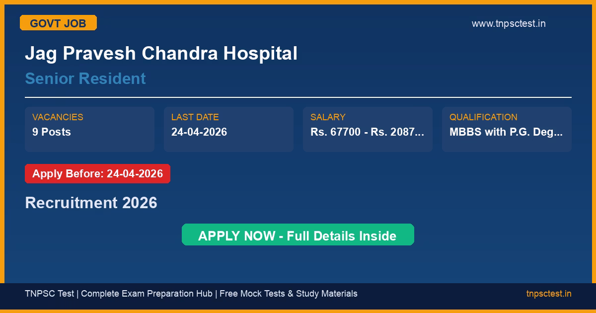 Jag Pravesh Chandra Hospital has released an official recruitment notification for the post of Senior Resident. A total of 9 vacancies have been announced for this government recruitment 2026. Candidates who have completed MBBS with P.G. Degree/Diploma/DNB in the concerned speciality, Valid registration with Delhi Medical Council, Not completed 03 years Senior Residency including regular & adhoc from a recognized university or institution are eligible to apply. The last date to submit the online application is 24-04-2026. Read below for complete details on eligibility criteria, application fee, selection process, salary, and how to apply for this Jag Pravesh Chandra Hospital recruitment.