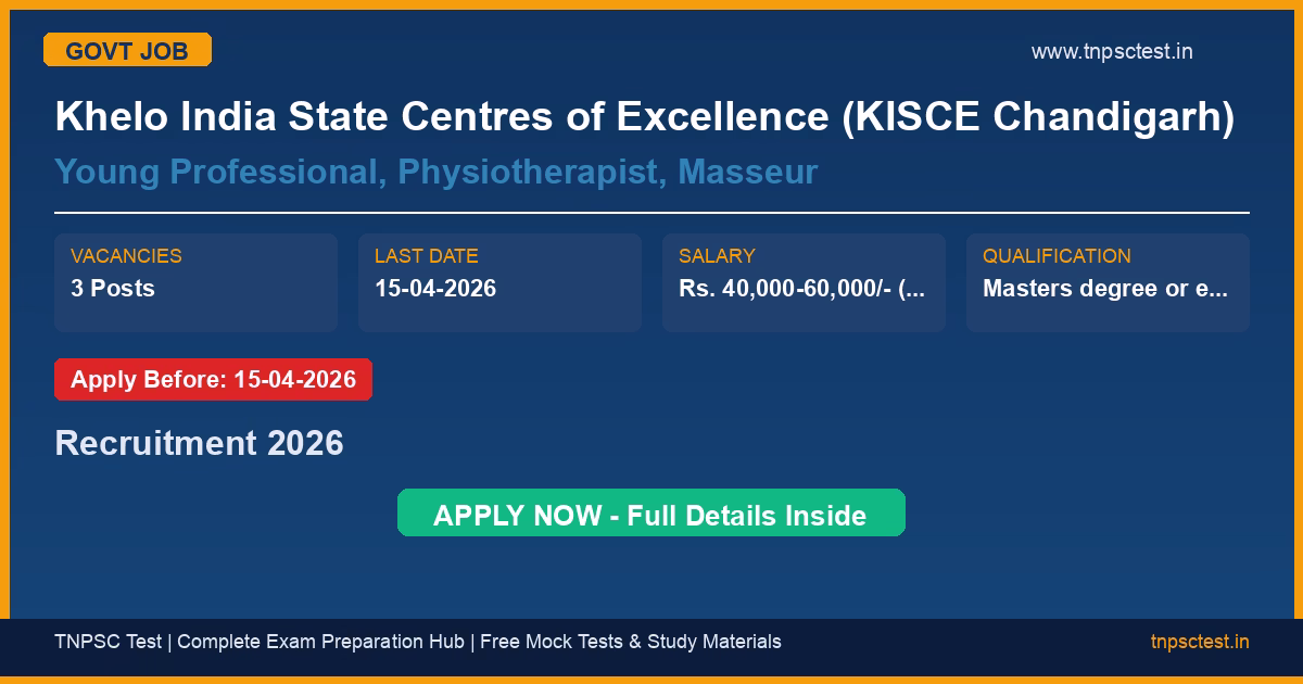 Khelo India State Centres of Excellence (KISCE Chandigarh) has released an official recruitment notification for the post of Young Professional, Physiotherapist, Masseur. A total of 3 vacancies have been announced for this government recruitment 2026. Candidates who have completed Masters degree or equivalent qualification/ Bachelor’s degree with Post Graduate Diploma in Sports Management or equivalent from a recognized University with minimum 50% marks OR Graduate with at least three years of work experience for Young Professional; Masters in Physiotherapy from any recognized Indian or Foreign University for Physiotherapist; Passed 10+2 from a recognized board with a certificate course/skill development program for Masseur/Masseuse/Massage Therapy/Sports Masseur/ Masseuse from a recognized institution for Masseur. from a recognized university or institution are eligible to apply. The last date to submit the online application is 15-04-2026. Read below for complete details on eligibility criteria, application fee, selection process, salary, and how to apply for this Khelo India State Centres of Excellence (KISCE Chandigarh) recruitment.