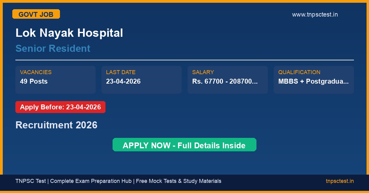 Lok Nayak Hospital has released an official recruitment notification for the post of Senior Resident. A total of 49 vacancies have been announced for this government recruitment 2026. Candidates who have completed MBBS + Postgraduate Degree/DNB/Diploma or equivalent in the concerned specialty, Preferably valid DMC registration for the specialty from a recognized university or institution are eligible to apply. The last date to submit the online application is 23-04-2026. Read below for complete details on eligibility criteria, application fee, selection process, salary, and how to apply for this Lok Nayak Hospital recruitment.