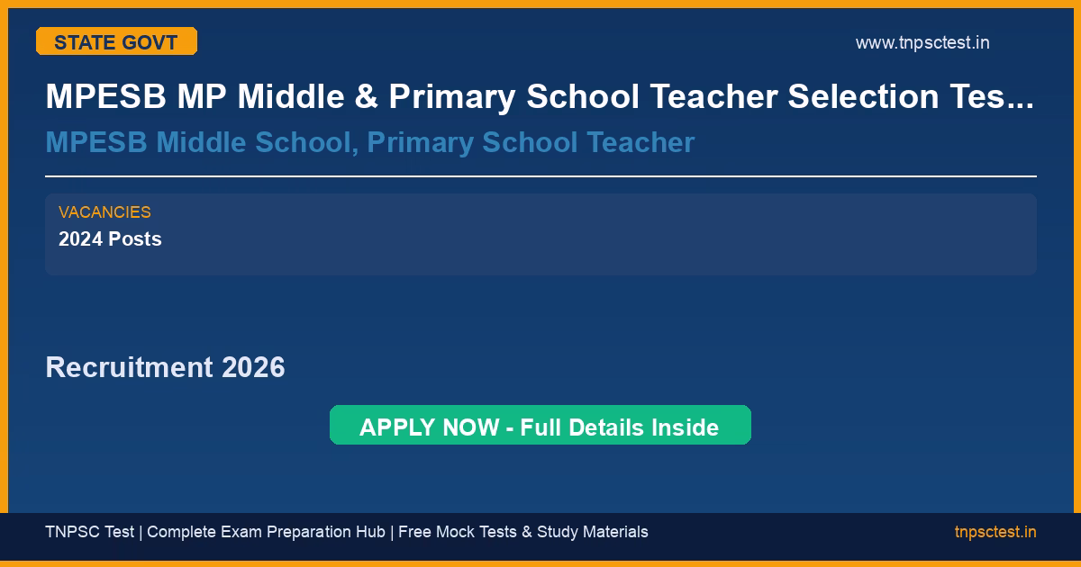 MPESB MP Middle & Primary School Teacher Selection Test Notification 2024 : Age Limit as on 01/01/2024 Minimum Age : 21 Years. Maximum Age : 40 Years. Age Relaxation Extra as per MP Employee Selection Board MP ESB Madhyamik Shikshak (Vishay, khel and sangeet-vadan), Prathamik Shikshak (Khel, Sangeet-Vadan and Nritya) Under M.P. Govt., School Shiksha Department Selection test and Madhyamik Shikshak (Vishay), Prathamik Shikshak (Khel, Sangeet-Vadan and Nritya) Under M.P. Govt., Janjatiya Karya Department Selection test 2024. has released an official recruitment notification for the post of MPESB Middle School, Primary School Teacher. A total of MP ESB Middle School Teacher & Primary School Teacher Recruitment 2024 : Vacancy Details Total : 10758 Post vacancies have been announced for this state government recruitment 2026. Read below for complete details on eligibility criteria, application fee, selection process, salary, and how to apply for this MPESB MP Middle & Primary School Teacher Selection Test Notification 2024 : Age Limit as on 01/01/2024 Minimum Age : 21 Years. Maximum Age : 40 Years. Age Relaxation Extra as per MP Employee Selection Board MP ESB Madhyamik Shikshak (Vishay, khel and sangeet-vadan), Prathamik Shikshak (Khel, Sangeet-Vadan and Nritya) Under M.P. Govt., School Shiksha Department Selection test and Madhyamik Shikshak (Vishay), Prathamik Shikshak (Khel, Sangeet-Vadan and Nritya) Under M.P. Govt., Janjatiya Karya Department Selection test 2024. recruitment.