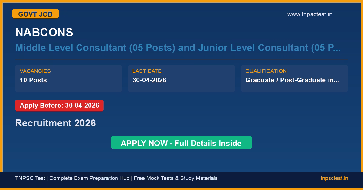 NABCONS has released an official recruitment notification for the post of Middle Level Consultant (05 Posts) and Junior Level Consultant (05 Posts). A total of 10 Posts vacancies have been announced for this government recruitment 2026. Candidates who have completed Graduate / Post-Graduate in Agriculture and allied subjects* (Agriculture, Horticulture, Forestry, Agricultural Engineering, Dairy Technology, Veterinary and Animal Science only) from a recognized university or institution are eligible to apply. The last date to submit the online application is 30-04-2026. Read below for complete details on eligibility criteria, application fee, selection process, salary, and how to apply for this NABCONS recruitment.