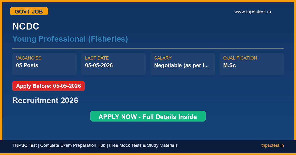 NCDC has released an official recruitment notification for the post of Young Professional (Fisheries). A total of 05 vacancies have been announced for this government recruitment 2026. Candidates who have completed M.Sc from a recognized university or institution are eligible to apply. The last date to submit the online application is 05-05-2026. Read below for complete details on eligibility criteria, application fee, selection process, salary, and how to apply for this NCDC recruitment.