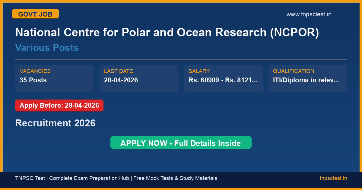 National Centre for Polar and Ocean Research (NCPOR) has released an official recruitment notification for the post of Various Posts. A total of 35 vacancies have been announced for this government recruitment 2026. Candidates who have completed ITI/Diploma in relevant trade with experience, Bachelor’s degree in relevant field with experience. from a recognized university or institution are eligible to apply. The last date to submit the online application is 28-04-2026. Read below for complete details on eligibility criteria, application fee, selection process, salary, and how to apply for this National Centre for Polar and Ocean Research (NCPOR) recruitment.