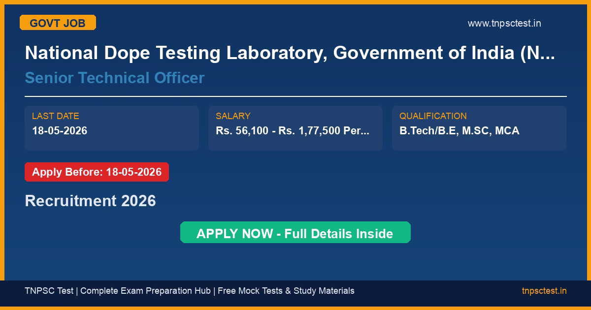 National Dope Testing Laboratory, Government of India (NDTL) has released an official recruitment notification for the post of Senior Technical Officer. Candidates who have completed B.Tech/B.E, M.SC, MCA from a recognized university or institution are eligible to apply. The last date to submit the online application is 18-05-2026. Read below for complete details on eligibility criteria, application fee, selection process, salary, and how to apply for this National Dope Testing Laboratory, Government of India (NDTL) recruitment.