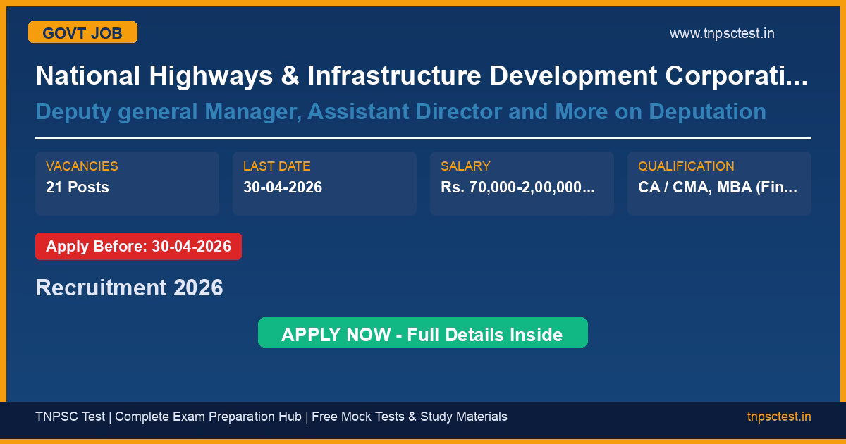 National Highways & Infrastructure Development Corporation Limited (NHIDCL) has released an official recruitment notification for the post of Deputy general Manager, Assistant Director and More on Deputation. A total of 21 vacancies have been announced for this government recruitment 2026. Candidates who have completed CA / CMA, MBA (Finance), M.Com, Bachelor’s Degree, LL.B., B.E./B.Tech (CS/IT), MCA, M.Sc (IT), M.Tech (Cyber Security), Graduate from a recognized university or institution are eligible to apply. The last date to submit the online application is 30-04-2026. Read below for complete details on eligibility criteria, application fee, selection process, salary, and how to apply for this National Highways & Infrastructure Development Corporation Limited (NHIDCL) recruitment.