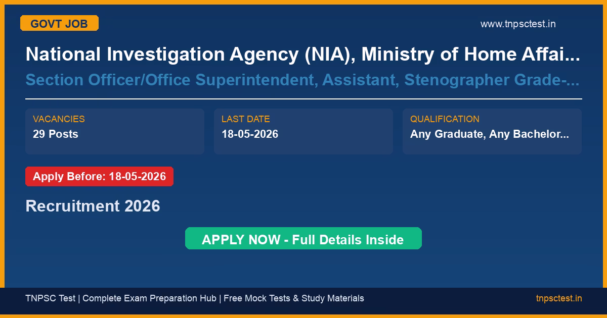 National Investigation Agency (NIA), Ministry of Home Affairs has released an official recruitment notification for the post of Section Officer/Office Superintendent, Assistant, Stenographer Grade-I, UDC, LDC. A total of 29 posts (subject to variation) vacancies have been announced for this government recruitment 2026. Candidates who have completed Any Graduate, Any Bachelors Degree, 12TH from a recognized university or institution are eligible to apply. The last date to submit the online application is 18-05-2026. Read below for complete details on eligibility criteria, application fee, selection process, salary, and how to apply for this National Investigation Agency (NIA), Ministry of Home Affairs recruitment.