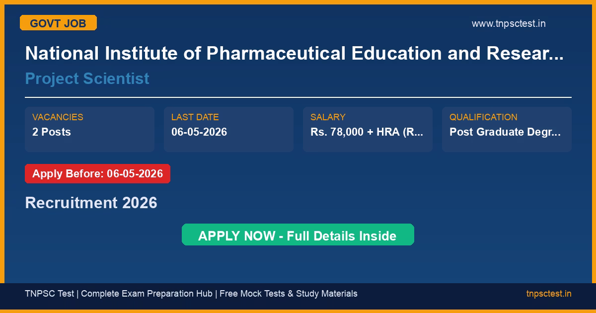 National Institute of Pharmaceutical Education and Research Guwahati (NIPER Guwahati) has released an official recruitment notification for the post of Project Scientist. A total of 2 vacancies have been announced for this government recruitment 2026. Candidates who have completed Post Graduate Degree or Ph.D, MPH from a recognized university or institution are eligible to apply. The last date to submit the online application is 06-05-2026. Read below for complete details on eligibility criteria, application fee, selection process, salary, and how to apply for this National Institute of Pharmaceutical Education and Research Guwahati (NIPER Guwahati) recruitment.